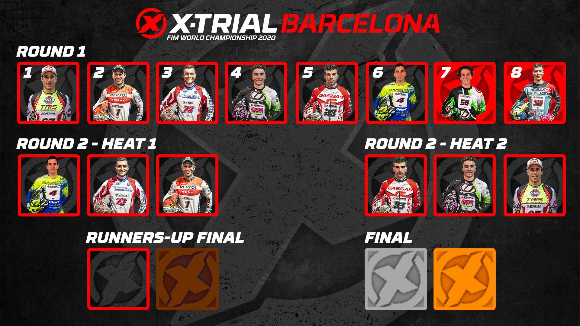 Für Vertigo war es ein ganz besonderes Ereignis, da die Marke über eine eigene Abteilung verfügte, die sich als eine der technischsten und schwierigsten der Nacht herausstellte. In Bezug auf die Ergebnisse war Miquel Gelabert der 7., er hat Momente der Brillanz hinterlassen, aber X-Trial lässt keine Fehler zu und mit 19 Punkten ist er nicht in die 2. Runde vorgerückt. Jaime Busto war kurz davor, sich in den Kampf um die Top 3 zu schleichen. Er war nur einen Punkt von der Qualifikation für das Finale der Zweitplatzierten entfernt. Er war Fünfter, belegte aber mit nur drei verbleibenden Runden weiterhin den dritten Tabellenplatz.