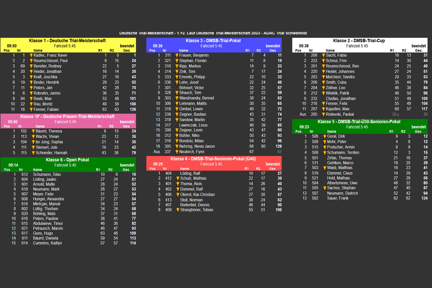 Armin Prutscher (MCH Singen e.V./Beta) sicherte sich am Samstag den Sieg in der Klasse 5, DMSB-Trial-Ü50-Senioren-Pokal), mit 10 Strafpunkten. Dirk Goral (Trialteam Bendestorf e.V./Vertigo) landete mit 14 Strafpunkten auf Rang zwei. Dritter wurde Torsten Schumann (MSC Weser-Solling e.V./Vertigo) mit 20 Strafpunkten. Am Sonntag setzte sich Dirk Goral mit 12 Strafpunkten gegen die Konkurrenz durch. Peter Mohr (MC Neuburg e.V./Montesa) landete punktgleich mit Goral, aber mit einer fehlerfrei gefahrenen Sektion weniger auf dem zweiten Platz. Armin Prutscher komplettierte das Podest mit 14 Strafpunkten.